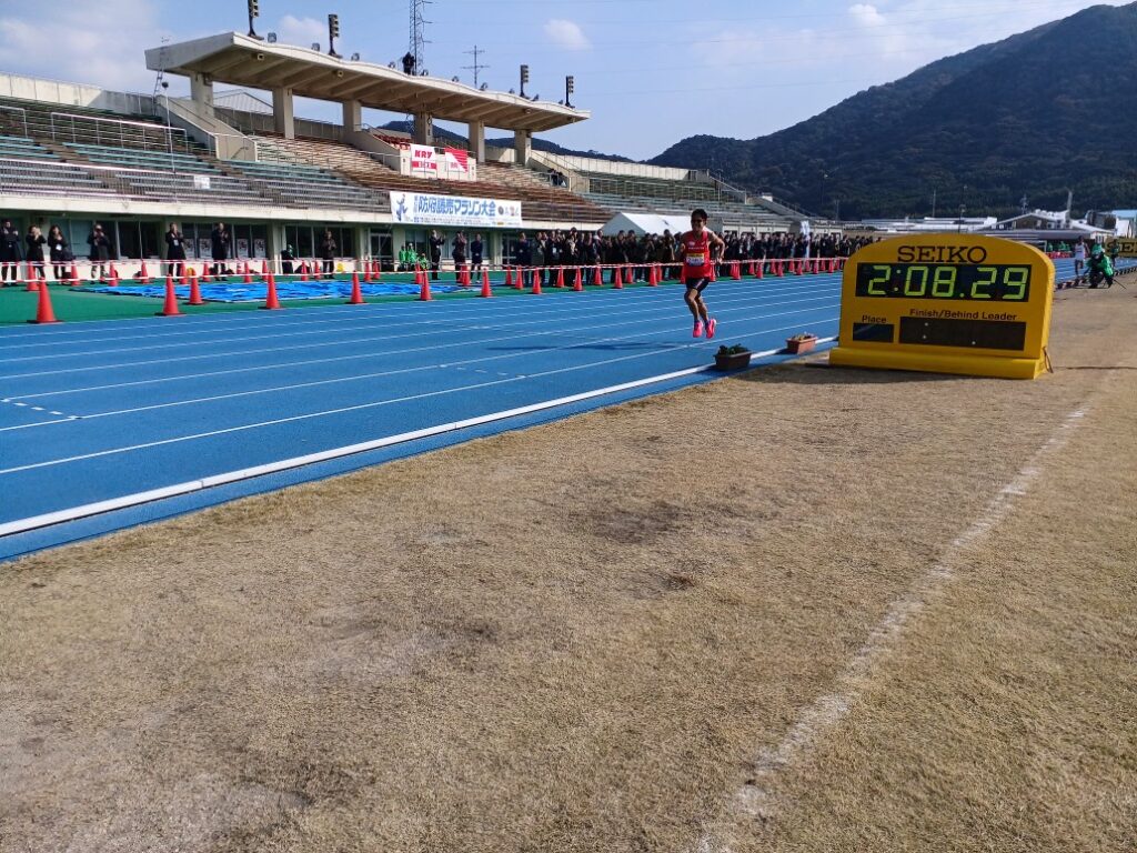 その直後、Y選手が前に出てペースを上げましたが、そのペースについていけたのは35k付近まで……。それでも自分なりに粘り抜き、何とか平和台陸上競技場に戻ってきました。その入口からゴールまで約500mですが、視界に飛び込んできたのは、ガッツポーズでゴールするY選手の後ろ姿でした。そして、ゴール脇にある時計に目を移すと、「2時間19分台」。