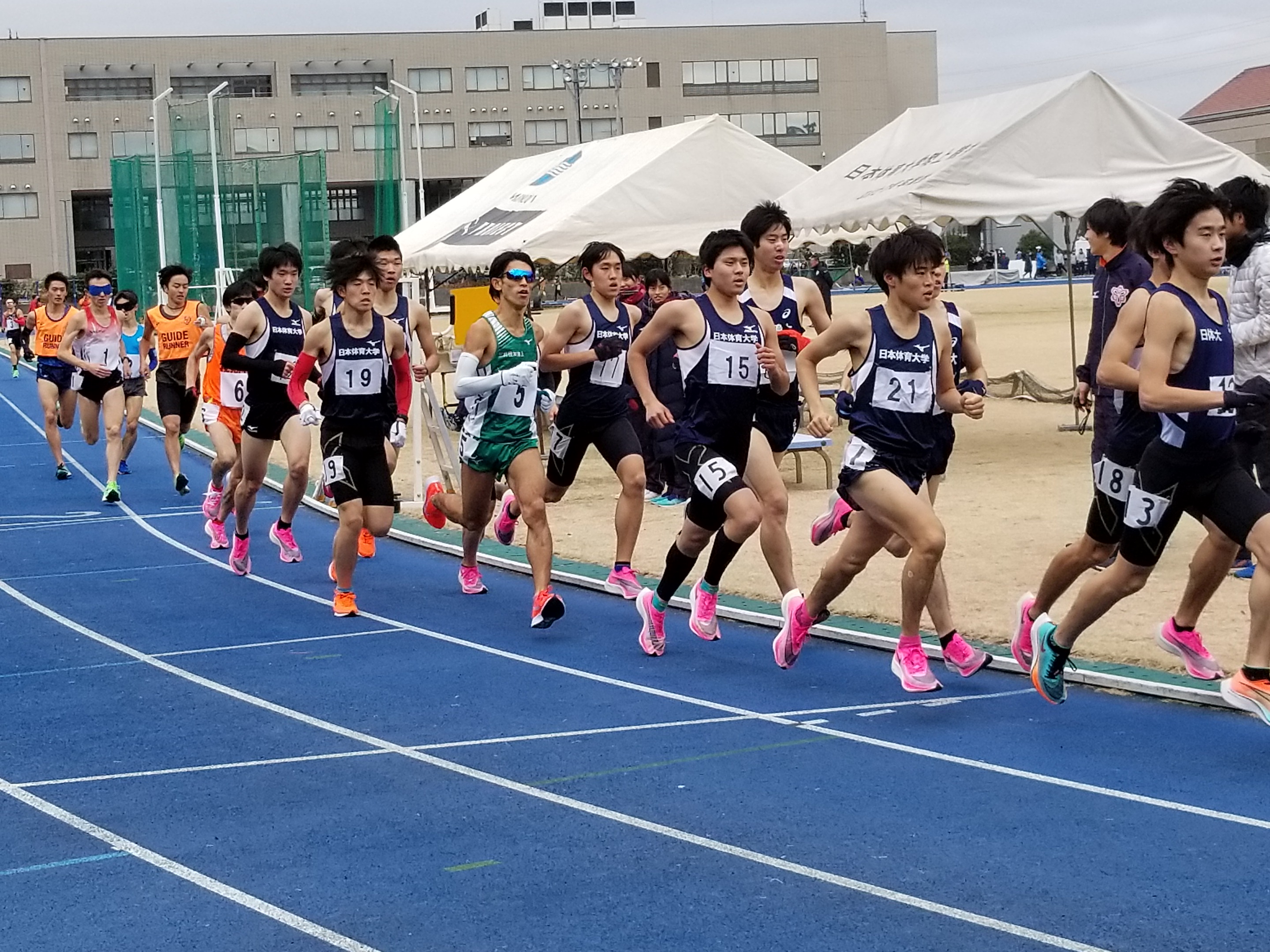 記録会当日の天候は曇り、気温は10度以下とかなり冷え込みましたが、風もなく、長距離種目にとっては絶好のコンディションとなりました。注目の視覚障がい男子選手が出場する5000mは12時15分スタート。
